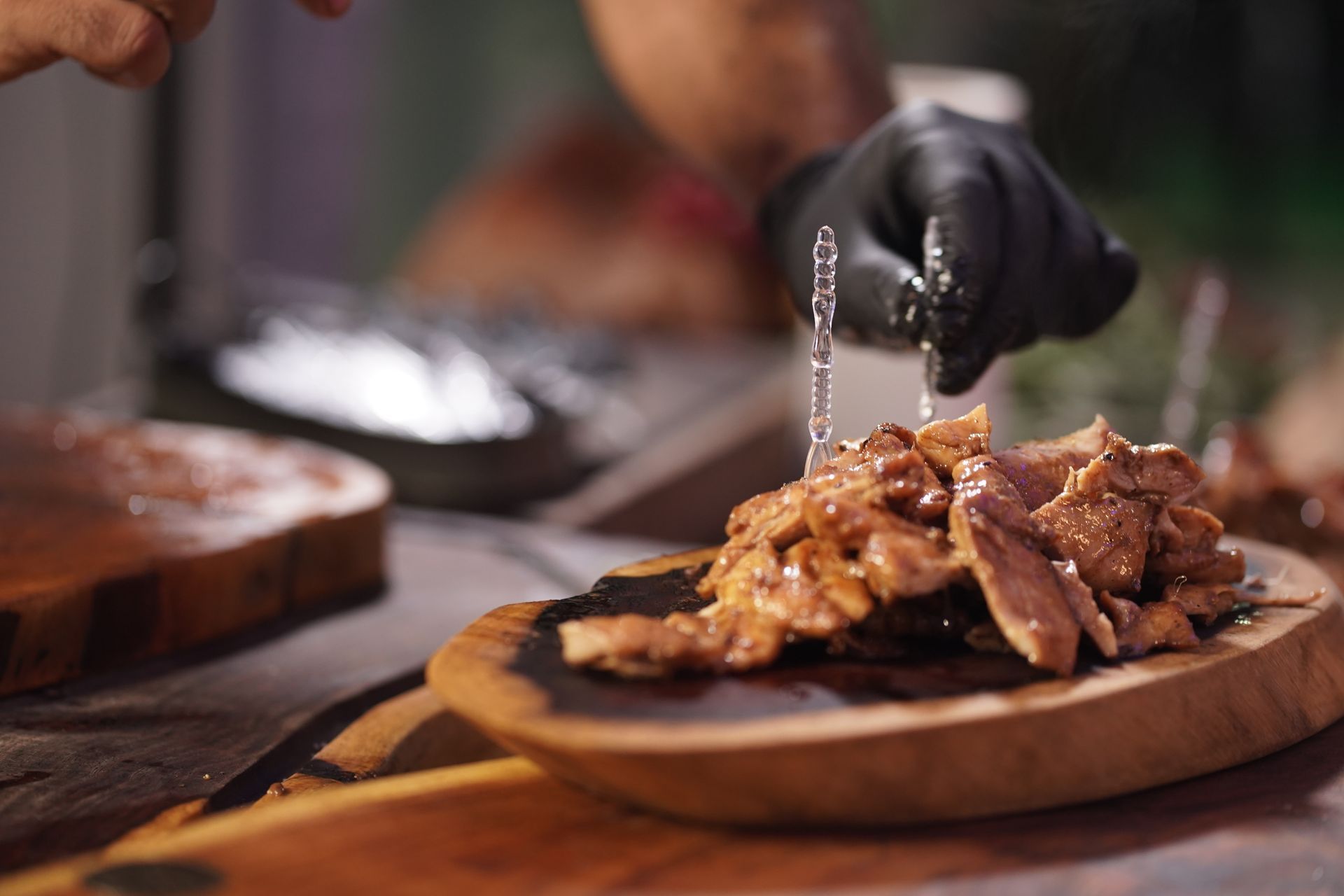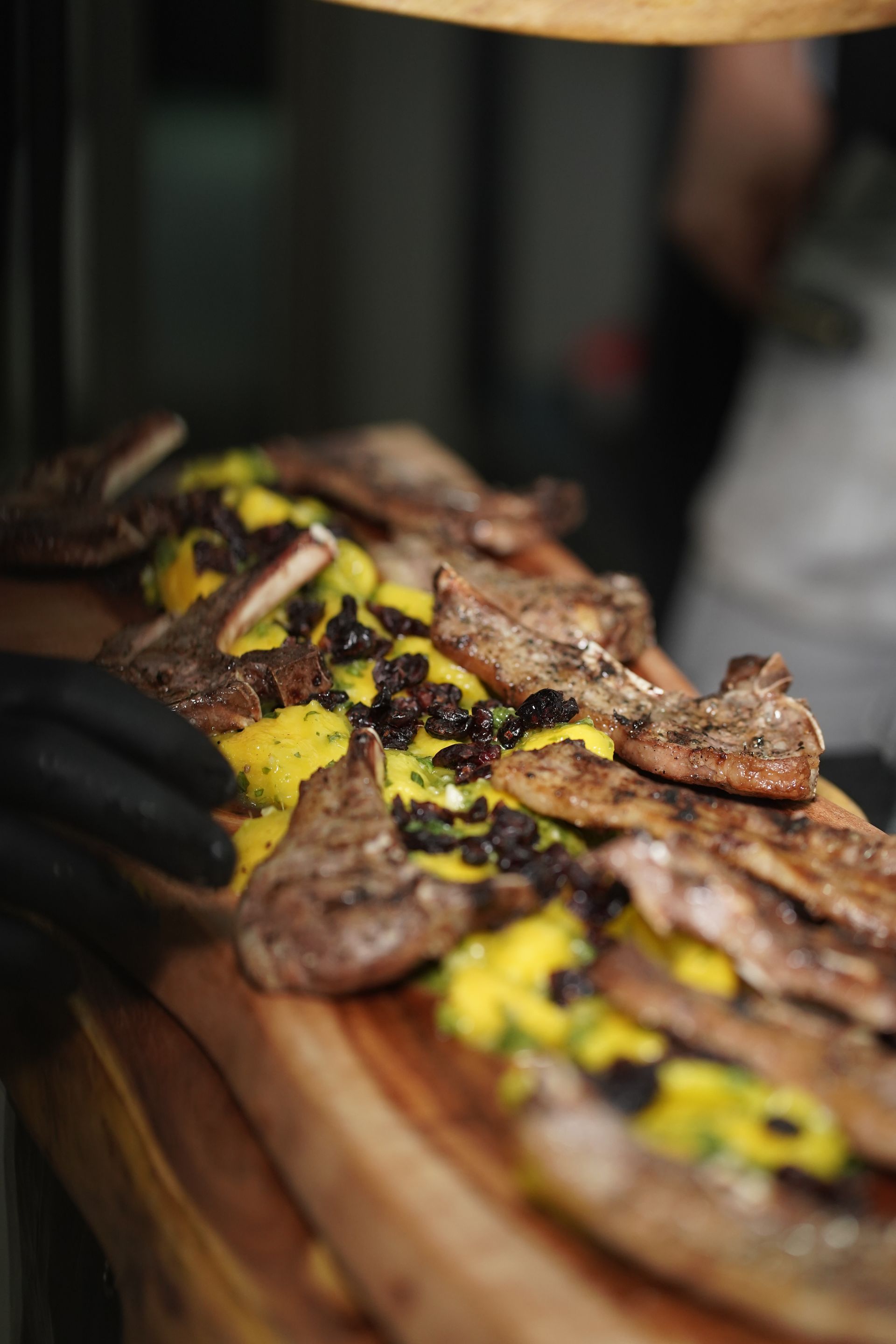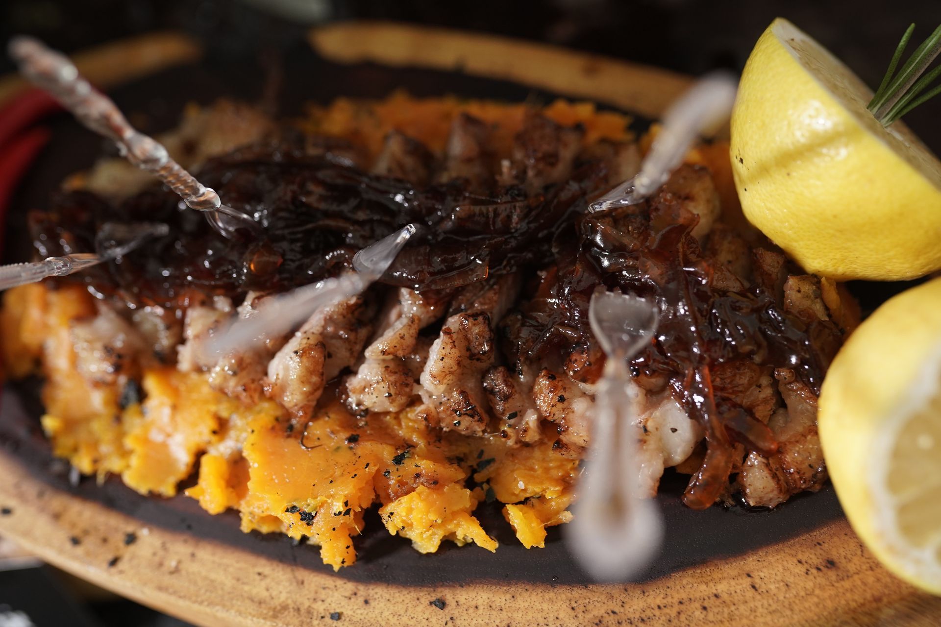 הנתח עובר צלייה וקרמול ייחודים על הגריל להדגשת הטעמים והעסיסיות של הבשר, מוגש פרוס בליווי שום קונםי וריבת בצל.