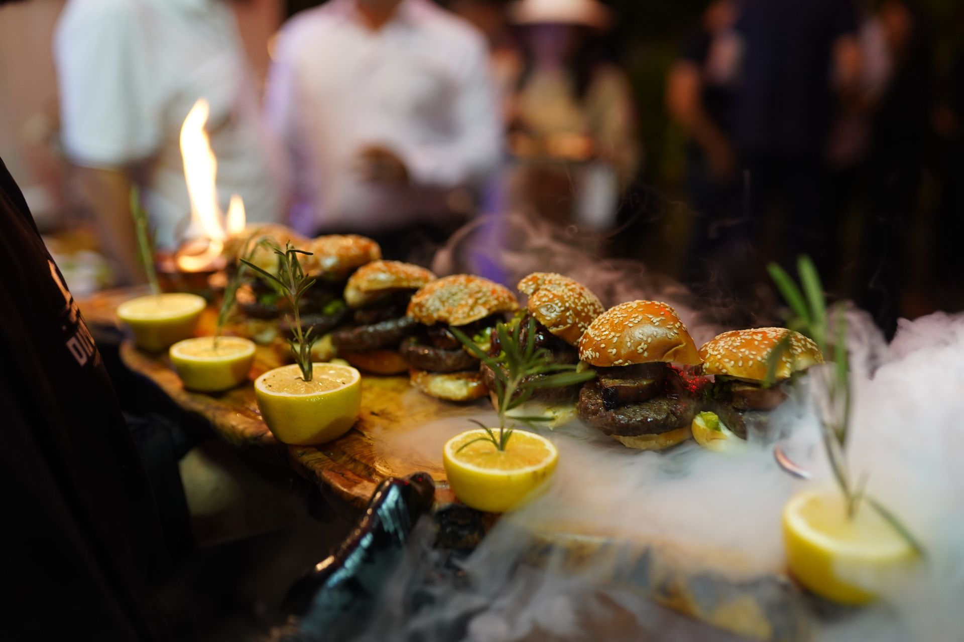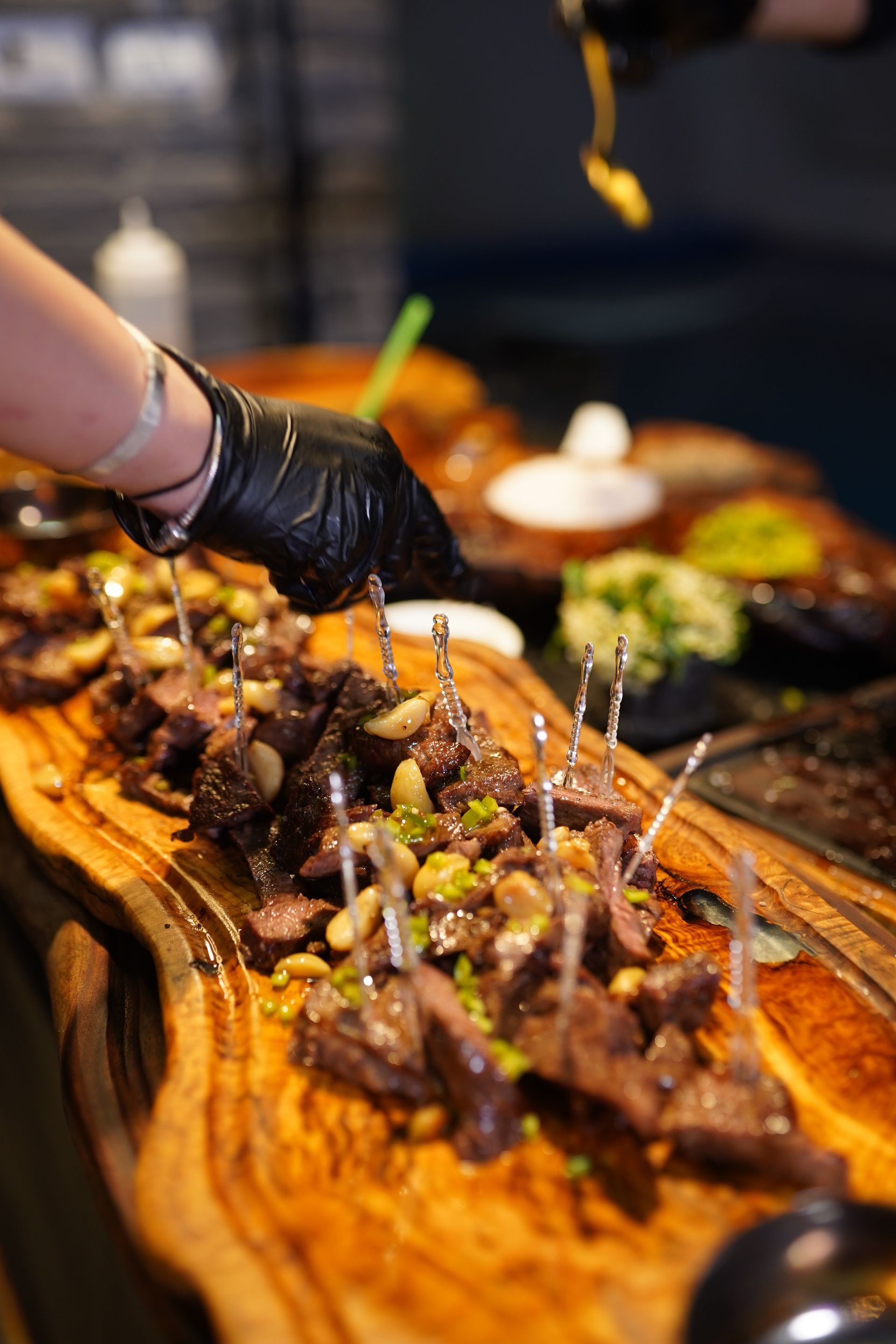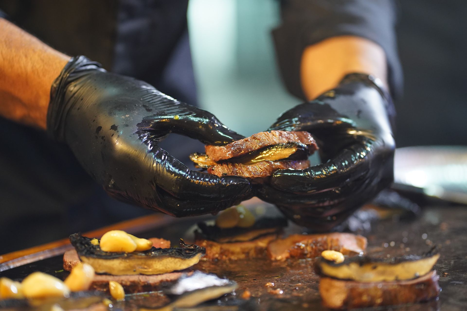 הנתח עובר צלייה וקרמול ייחודים על הגריל להדגשת הטעמים והעסיסיות של הבשר, מוגש פרוס בליווי שום קונםי וריבת בצל.