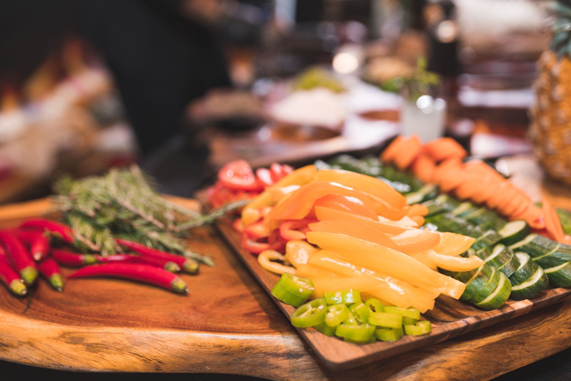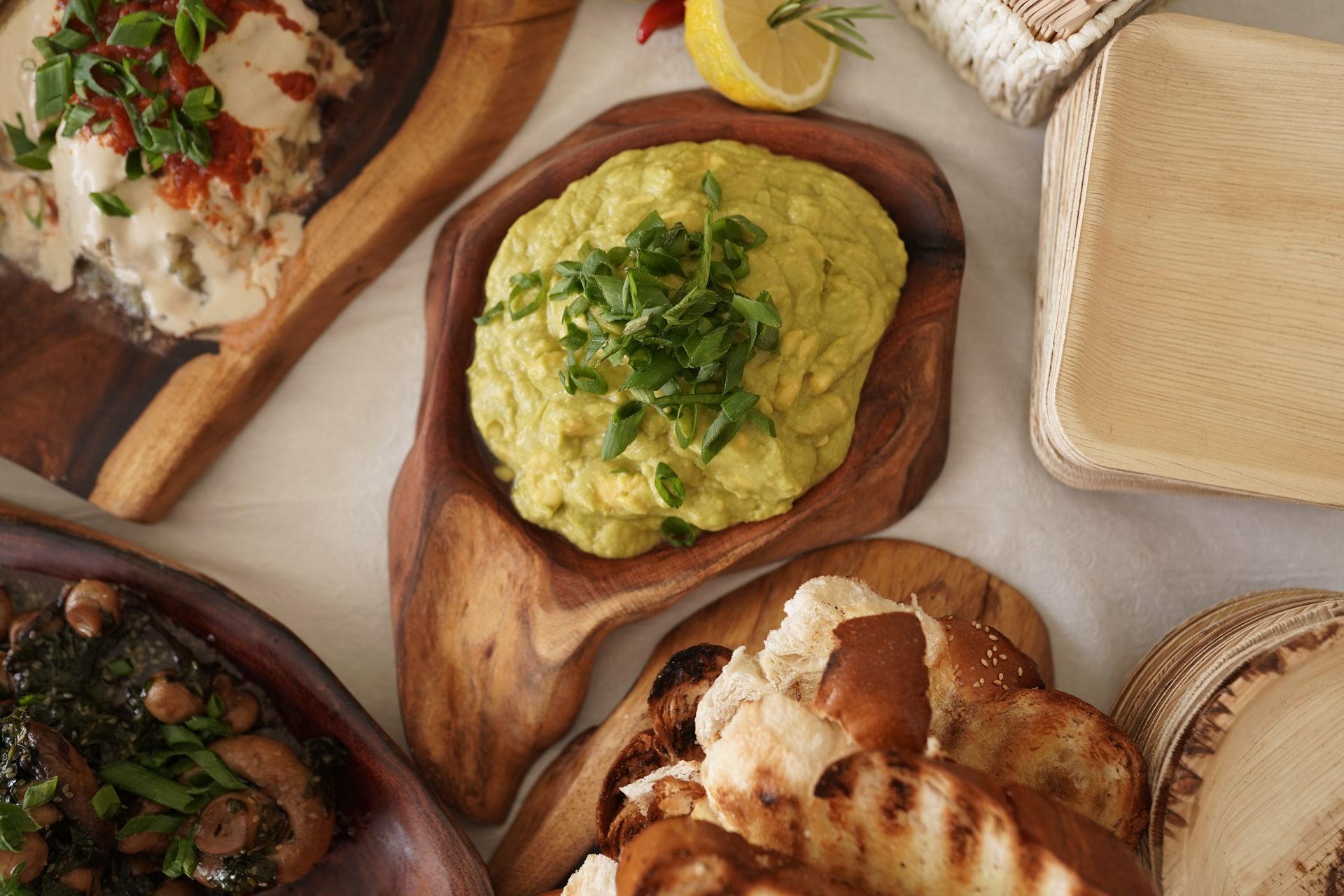 שלל ירקות לויים על הגריל מוגשים בליווי מטבלים אותנטים.