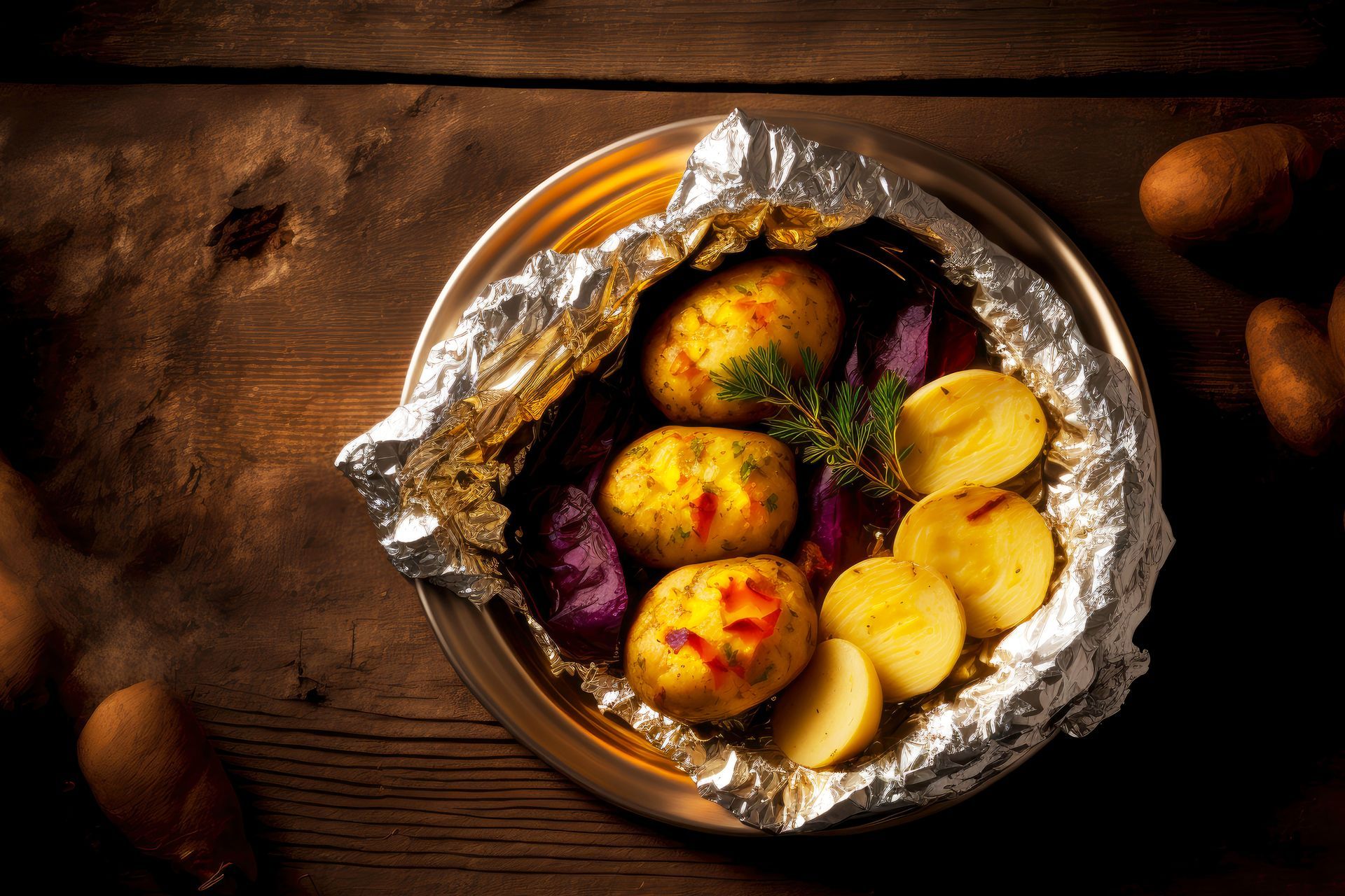 תפוחי אדמה ובטטות צלויים בגריל, מוגשים עם רוטב הבית ותערובת תבלינים דרום אמריקאים.