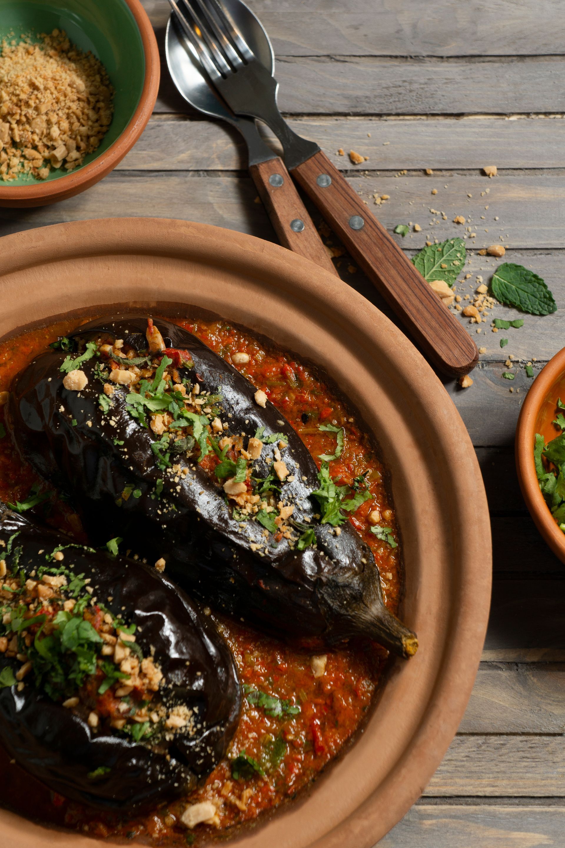 חציל באלדי צלוי על הגריל בטעמים מעושנים מוגש בליווי טחינה קרה ותערובת תבלינים מיוחדת.
